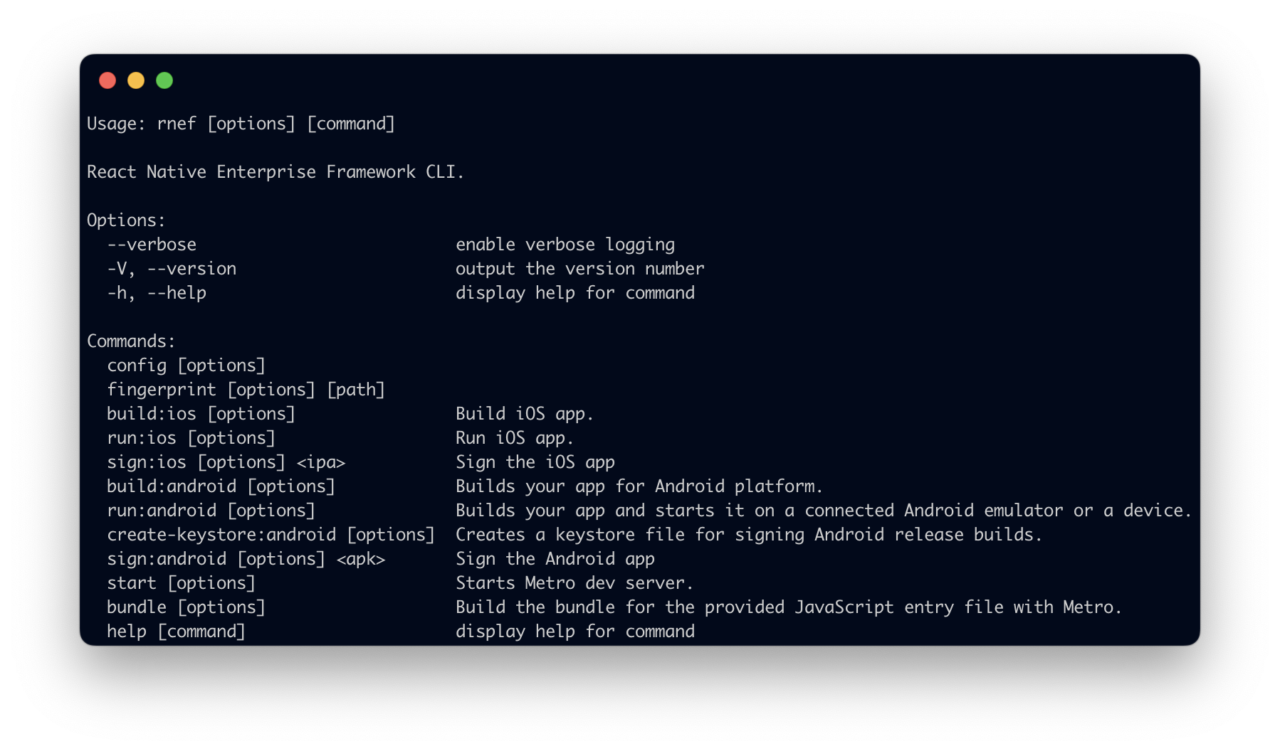 rnef CLIThe RNEF CLI is a command-line tool that helps you develop, build, and run React Native applications.