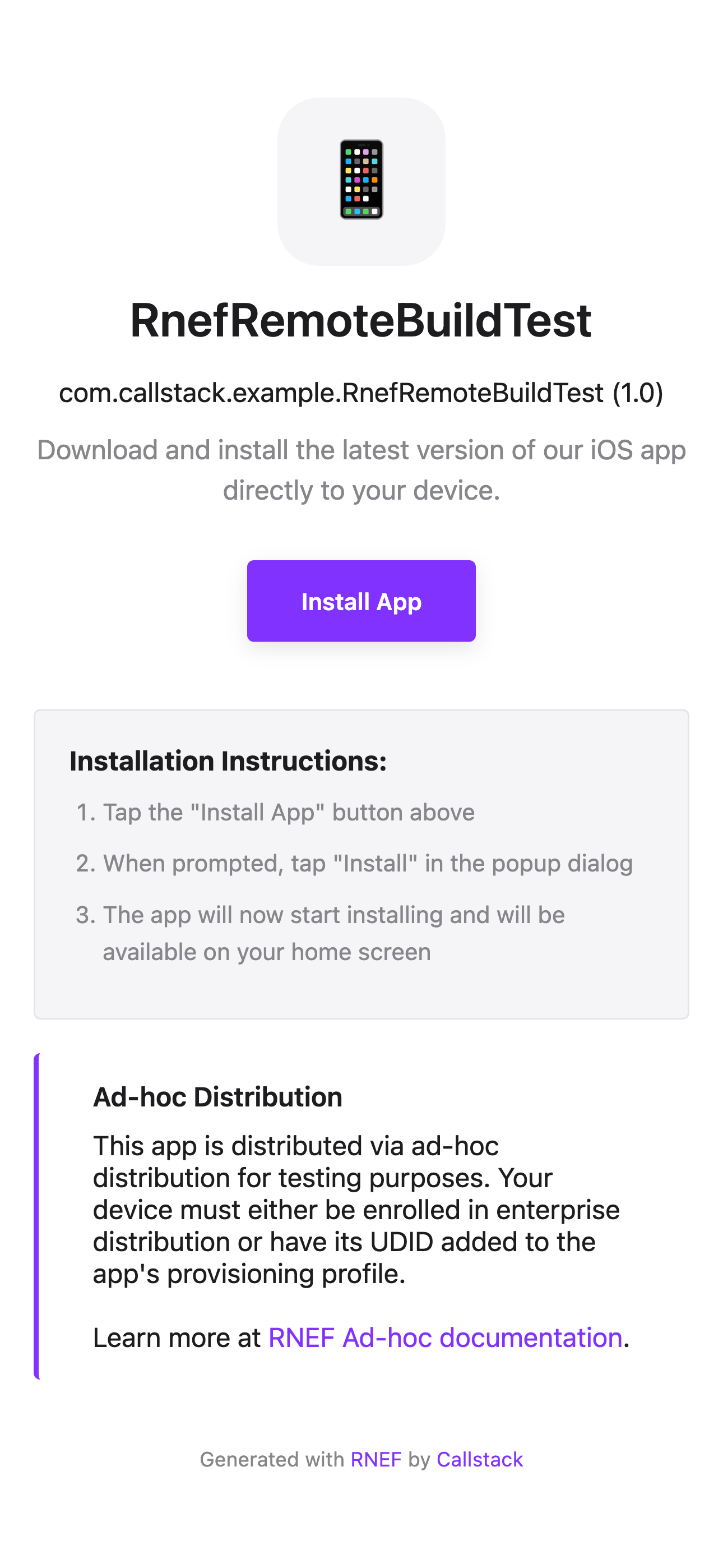 <directory>/ad-hoc/<artifactName>/<AppName>.ipaindex.html landing page (make sure it's accessible for testers)manifest.plistThis index.html file will display an ad-hoc distribution web portal, allowing developers and testers to install apps on their provisioned devices by simply clicking "Install App".